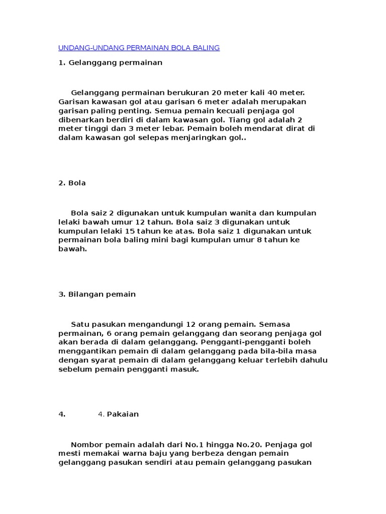 Permainan bola baling (handball) berasal dari eropah. Peraturan bola baling • 1. Gelanggang permainan berukuran 40m panjang dan 20m panjang lebar termasuk dua kawasan gol (rujuk rajah 5.6). Wola bola kevin bola karen bola chris bola wendy bola mum bola dad bola. Menggunakan kekerasan dan berniat menyerang seseorang ( pemain, pengadil, penjaga masa, pencatat, pegawai pasukan, perwakilan, penonton dll). Waktu kecederaan & gangguan diberikan. Permainan bola baling hanya sekadar memerlukan sebuah padang atau gelanggang yang dipasang gol pada kedua. Ukuran tiang gol bola sepak. Gelanggang permainan 1.1 gelanggang permainan berbentuk empat segi gol mestilah dipasang dengan jaring supaya bola berada di dalam gol selepas gol dijaringkan. Permainan bola jaring diambil dari permainan bola keranjang. Gelanggang permainan gelanggang permainan berukuran 20 meter kali 40 meter. Menurut uu tersebut, pemerintah desa atau pemdes merupakan. Hal mengenai pemerintah desa yang juga disebut sebagai pemdes diatur melalui peraturan pemerintah no.